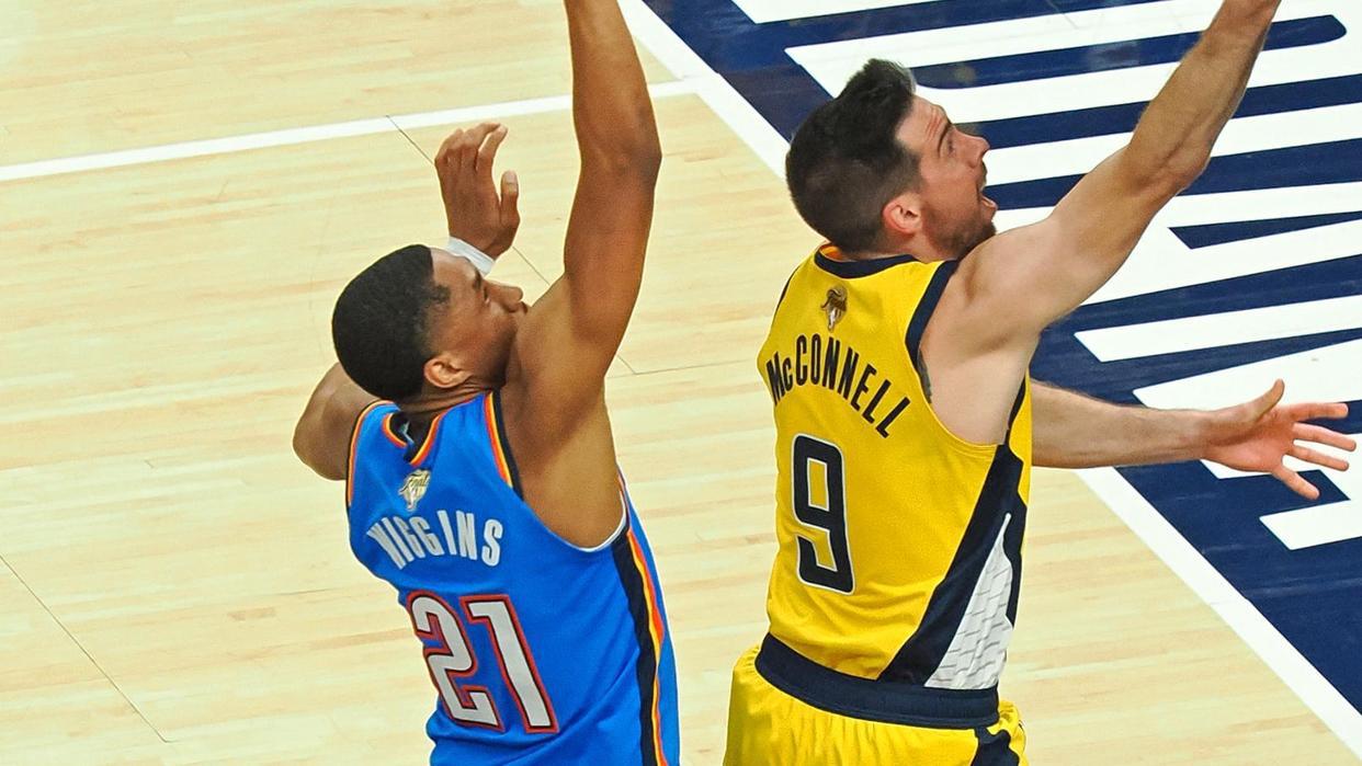 次节较量,亚历山大中距离得分,麦康奈尔上篮得手还以颜色,西亚卡姆、亚历山大各有单打命中,特纳外线不中还出现失误,杰伦威廉姆斯上篮得分,卡莱尔请求暂停。麦康奈尔跳投得分,杰伦威廉姆斯2罚全中,随后出现失误,麦康奈尔继续中距离发难,随后抢断华莱士,还助攻哈利伯顿轰进三分球。卡鲁索进攻犯规,布拉德利抢下前场篮板上篮得分,雷霆请求暂停。霍姆格伦外线不中,内姆哈德失误,麦康奈尔抢断亚历山大,布拉德利2罚1中,霍姆格伦上篮不进,空接也出现打铁,内史密斯轰进远投。