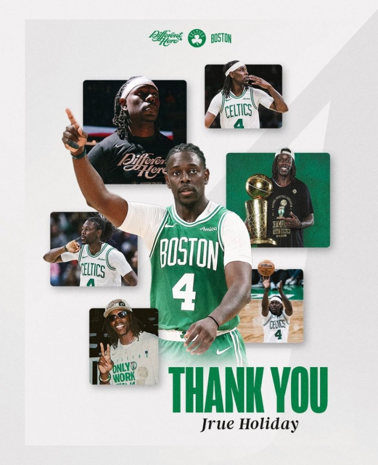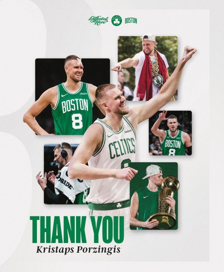 凯尔特人官方晒图致谢波尔津吉斯和霍勒迪道:“永远的凯尔特人冠军🏆☘️, 感谢你们所做的一切。”