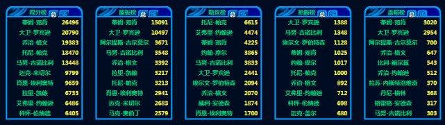 得分榜和篮板榜毫无疑问是第一,26496分马刺队史第一,15091个篮板也是第一。助攻榜排在第三4225个,抢断榜在第四位1025个,作为一名中锋有这样的数据也是非常的不错了。至于盖帽榜还是第一位3020个。