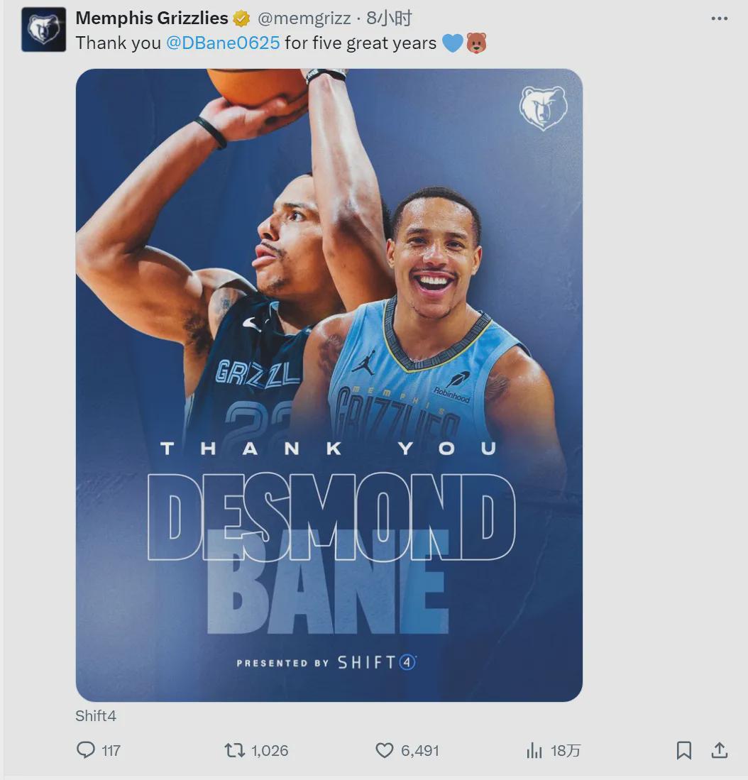 2023年季后赛,灰熊首轮被湖人4-2“黑七”。2023年休赛期,灰熊拒绝给狄龙续约合同,他以4年9000万美元加盟火箭。2024年灰熊没能打进季后赛,2025年季后赛,首轮被雷霆4-0横扫。2025年休赛期,灰熊将贝恩交易至魔术队。