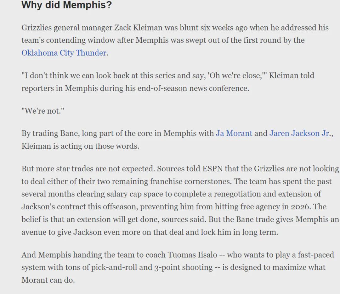 关于这笔交易的详情,咱们已经写过,这里不再赘述。今天主要聊聊灰熊接下来的操作,贝恩已经被送走,莫兰特和小贾伦-杰克逊会不会被交易?ESPN最新报道,灰熊无意交易队中两大核心,今夏将跟小贾伦-杰克逊完成续约。